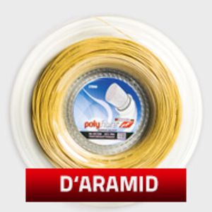 Polyfibre D‘Aramid, a combination of aromatic polyamides (aramid fibres) and high grade polyamide copolymer filaments, is known for its strength and extreme durability. Thanks to its abrasion-resistant characteristics, it is highly recommended as the main string in hybrids.