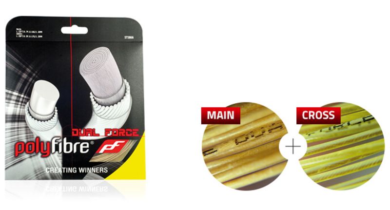 Dual Force is a hybrid string. Its main string is a blend of specially modified Aramid fibers and fine polyamide filaments which provides excellent durability and abrasion resistance. The cross string is our 17-gauge premium synthetic gut that produces increased return-energy to the ball.